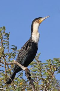 The White-necked Cormorant Phala-crocorax carbo, which is the most common type of cormorant in the Middle East, is a large bird with a long slim body and a long beak that is hooked at the tip. The adults are black all over with a small yellow pouch where the throat meets the beak. They also have yellow skin on their faces. This type of cormorant is found along the sea and lake coasts, along the larger rivers, and in swampy areas. It has webbed feet like a duck and swims in the water, but with most of the body under the water. It dives and can swim quite a long way underwater hunting fish.