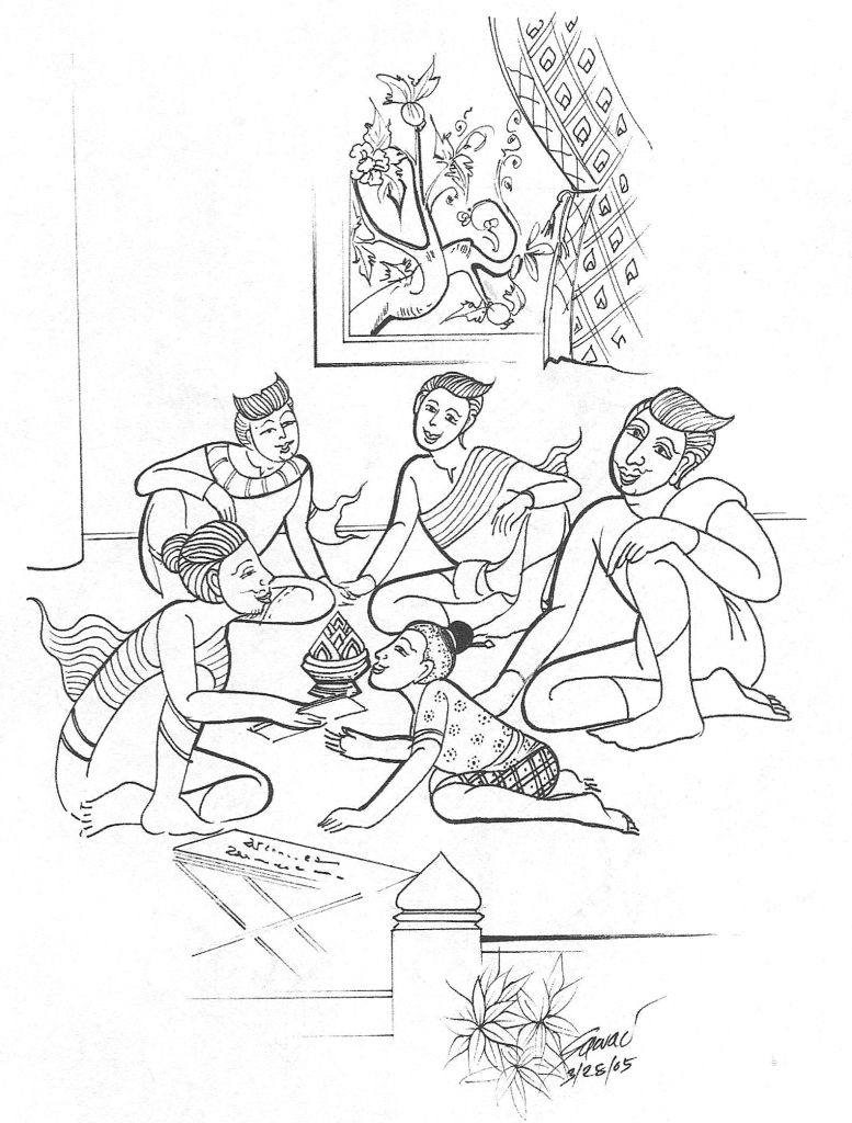 Drawing by Sawai Chinnawong who employs northern and central Thailand’s popular distinctive artistic style originally used to depict Buddhist moral principles and other religious themes; explanation by Paul DeNeui. From That Man Who Came to Save Us by Sawai Chinnawong and Paul H. DeNeui, William Carey Library, 2010.