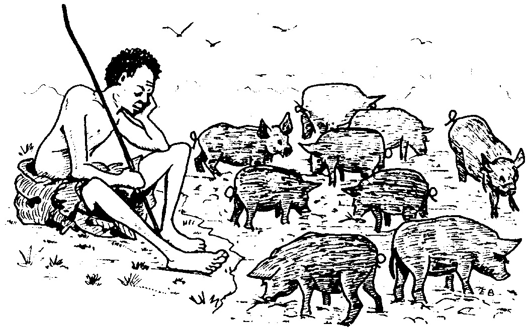 The story of feeding the pigs is illustrated for use in Bible translations in West Africa by Wycliffe Cameroon like this: