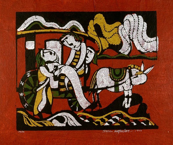 Hand colored stencil print on momigami by Sadao Watanabe (1989).