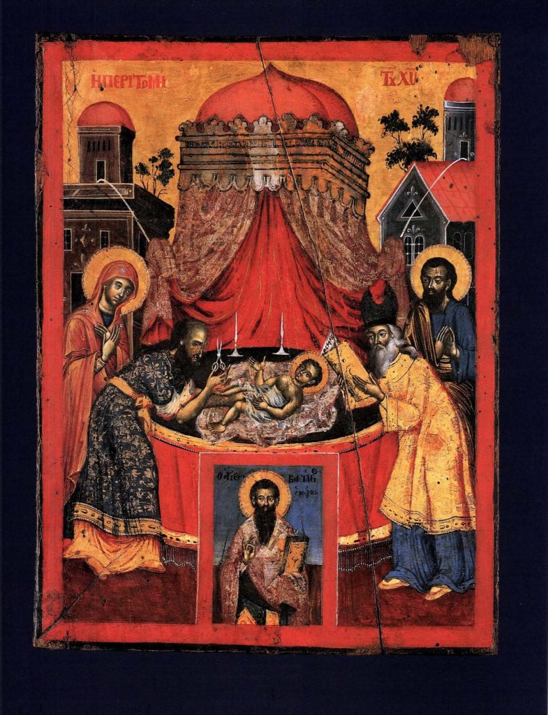 “The Circumcision of Christ is not depicted very often in Byzantine and Post-Byzantine painting, and is not included amongst the Twelve Great Feasts. According to the Gospel of Saint Luke (2:21), Joseph and Mary took Jesus to the temple when he was eight months old to have him circumcised and named. In the Orthodox Church, the Circumcision is celebrated on 1 January together with the memory of Basil the Great, which accounts for the depiction in the present icon of Saint Basil, who often accompanies the Circumcision in both earlier and later works. In the icon from the church of the Annunciation at Tirane, the painter followed a westernizing model presumably derived from an engraving, as in the other works in the same church. The representation is dominated by the ciborium with its rich curtain and decoration, and also by the round altar with its gold-embroidered cover, on which Christ lies, enveloped in a lacy fabric. The luxurious garments worn by the priests contrast with the plain appearance of Joseph and Mary, who are standing nearby.