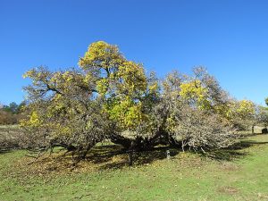 The black mulberry is a large, broad tree (6 meters [20 feet] high) that produces flowers and leaves in spring and loses its leaves every year in winter. The crown is broad and low. The trunk gets twisted as it grows old and may rot away, only to be replaced by another one from the same root. People pile stones up in order to support the low branches of old trees. The leaves are stiff, rough, and hairy. The flowers are pollinated by the wind, and the fruit is a rather tart, black berry about the size of a large cashew nut. In Europe and North America, people use mulberries mostly to make pies and wine. A different species, the white mulberry, has a whitish fruit.