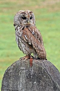 The Tawny Owl Strix aluco is a fairly rare bird in Israel, but where it is present, its call is unmistakable. The male calls with a series of hoots “HOO-hoo-hoo, hoo-HOO-hoo”, and the female replies with a higher pitched single hoot “HOO”. Its eyes are outlined with pale circles, so that it looks as though it is wearing spectacles. As its name indicates, it is a mottled gray-brown color. It prefers wooded areas or orchards and roosts close to the trunk of a tree.