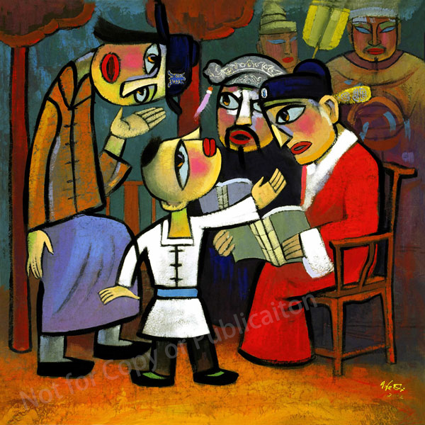 “The elders are both religious and political as indicated by their clothing. Thai scripture is written on folded palm leaf manuscripts and raised on small tables. The object in the bowl is used for ceremonial purposes. The boy’s hair will be cut at age twelve when, according to Thai tradition, he becomes a complete person. This makes his young wisdom all the more amazing.”