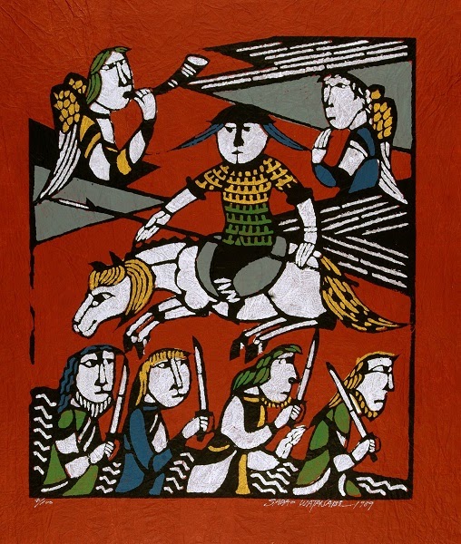 Hand colored stencil print on momigami by Sadao Watanabe (1998).